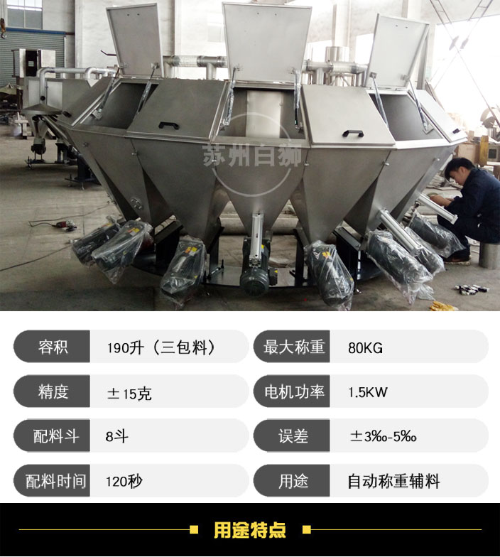 1、 單種物料誤差10克以內,九種原料(15KG)料兩分鐘左右。設備的型號一般配有4-9個料斗,容積約150-200L,也可根據客戶需求進行定制。常規配置中無料倉及接料斗除塵裝置。若帶料倉及接料斗除塵裝置,用管道及氣動閥門連接,分別用于料倉及接料斗除塵。