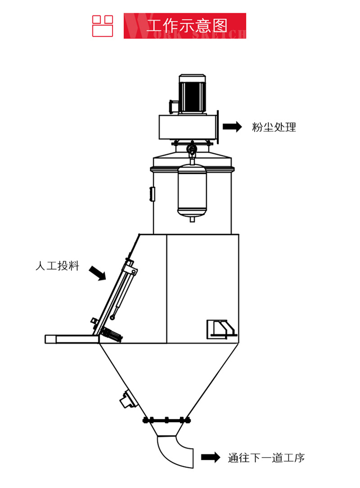 小袋投料站:該系統由人工卸料倉、防壓型投料平臺、下料倉、、濾芯、除塵風機、反吹氣包及振動電機等部件組成。