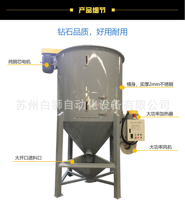 8、干燥混合功能二合一,當(dāng)不需要干燥時(shí),只需將加熱開(kāi)關(guān)及風(fēng)機(jī)開(kāi)關(guān)關(guān)閉,標(biāo)準(zhǔn)機(jī)型即可用于塑料攪拌均化用途,一機(jī)二用。塑料攪拌機(jī)